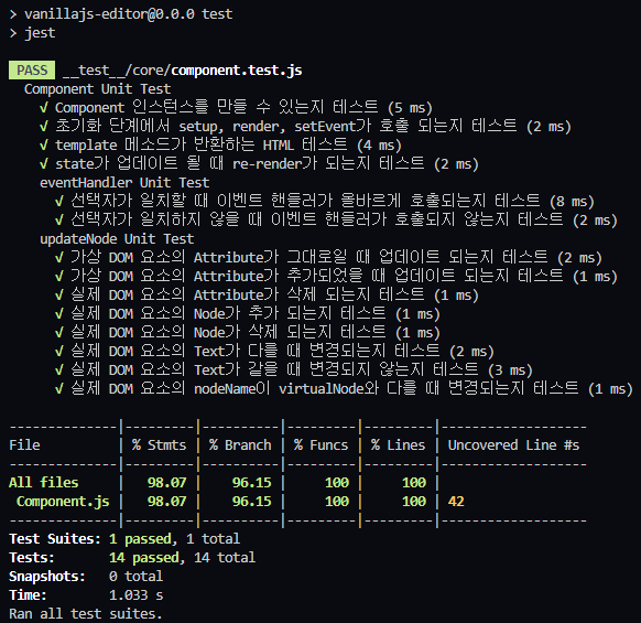 제가 Jest를 선택 한 이유와 테스트 코드의 장점, 환경 구축하는 법은 Jest를 Vite 프로젝트에 적용하기에 자세히 설명했습니다. Component 템플릿이 궁금하다면 4. 컴포넌트 템플릿 만들기와 5. VirtualDOM처럼 렌더링하기에 설명되어있습니다.