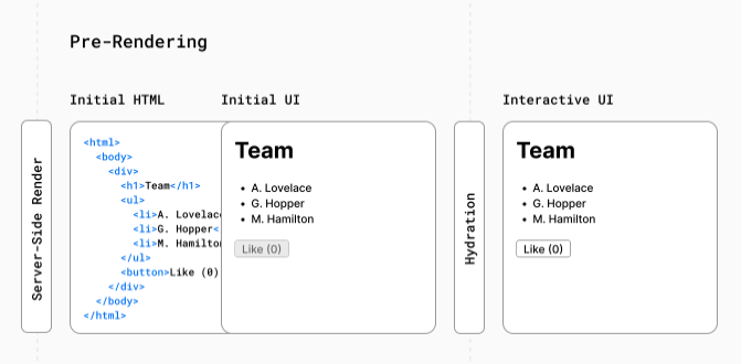 CSR에서 HTML은 빠른 non-interactive 페이지를 표시하는데 사용되는 반면, React는 JSON 데이터와 JavaScript를 이용해 구성요소를 인터렉티브하게 만듭니다. 이 과정을 우리는 Hydration이라 합니다.