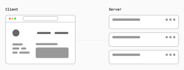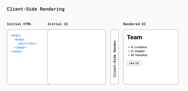 표준 React 애플리케이션에서 브라우저는 UI를 구성하기 위한 JavaScript 지침과 함께 서버로부터 빈 HTML 셸을 받습니다. 초기 렌더링 작업이 사용자 장치에서 발생하므로 이를 클라이언트 측 렌더링이라 합니다.