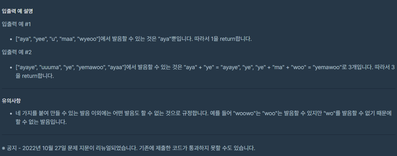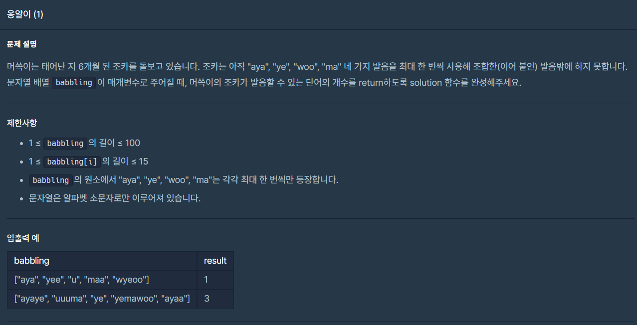 오늘은 프로그래머스 Lv.0 옹알이(1) 통과 코드를 작성하러왔습니다.